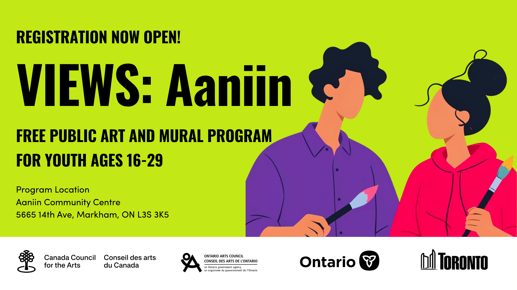 The 2026 edition will be hosted at the Aaniin Community Centre & Library in the heart of Southeast Markham. Through weekly workshops led by community artists and peer mentors, participants will explore painting, design, cultural storytelling, and collaborative mural-making, culminating in a large-scale public mural that reflects the identities, lived experiences, and voices of local youth.